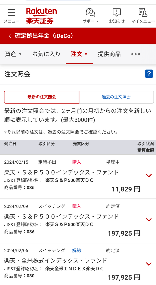 楽天全米株式で積み立てていたidecoを、楽天S&P500に変更しました。